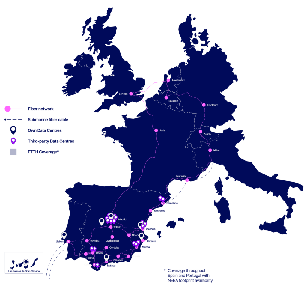 Red en la península ibérica con acceso a más de 20 centros neutros en puntos como Alicante, Valencia, Málaga, Talavera de la Reina, Barcelona, Cádiz, Madrid, Murcia, Sevilla, Zaragoza y Lisboa.